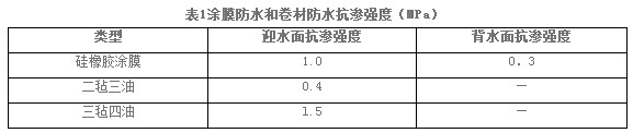 柔性材料大都為密閉型防水材料,用在迎水面抗?jié)B能力優(yōu)良,但用在背水面抗?jié)B能力低。據(jù)資料報(bào)道,柔性涂膜和卷材的抗?jié)B能力在迎水面和背水面是有很大區(qū)別的,見(jiàn)表1。